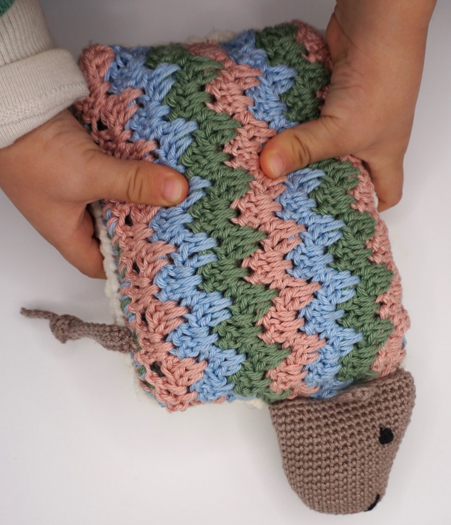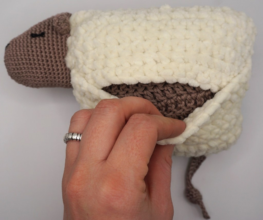 One side of the sheep ist crocheted with chenille yarn. It is soft, cuddly and calm. The sheep is sleeping – this side of the sheep is perfect for the baby to snuggle.