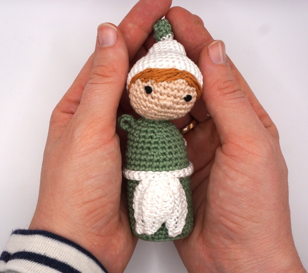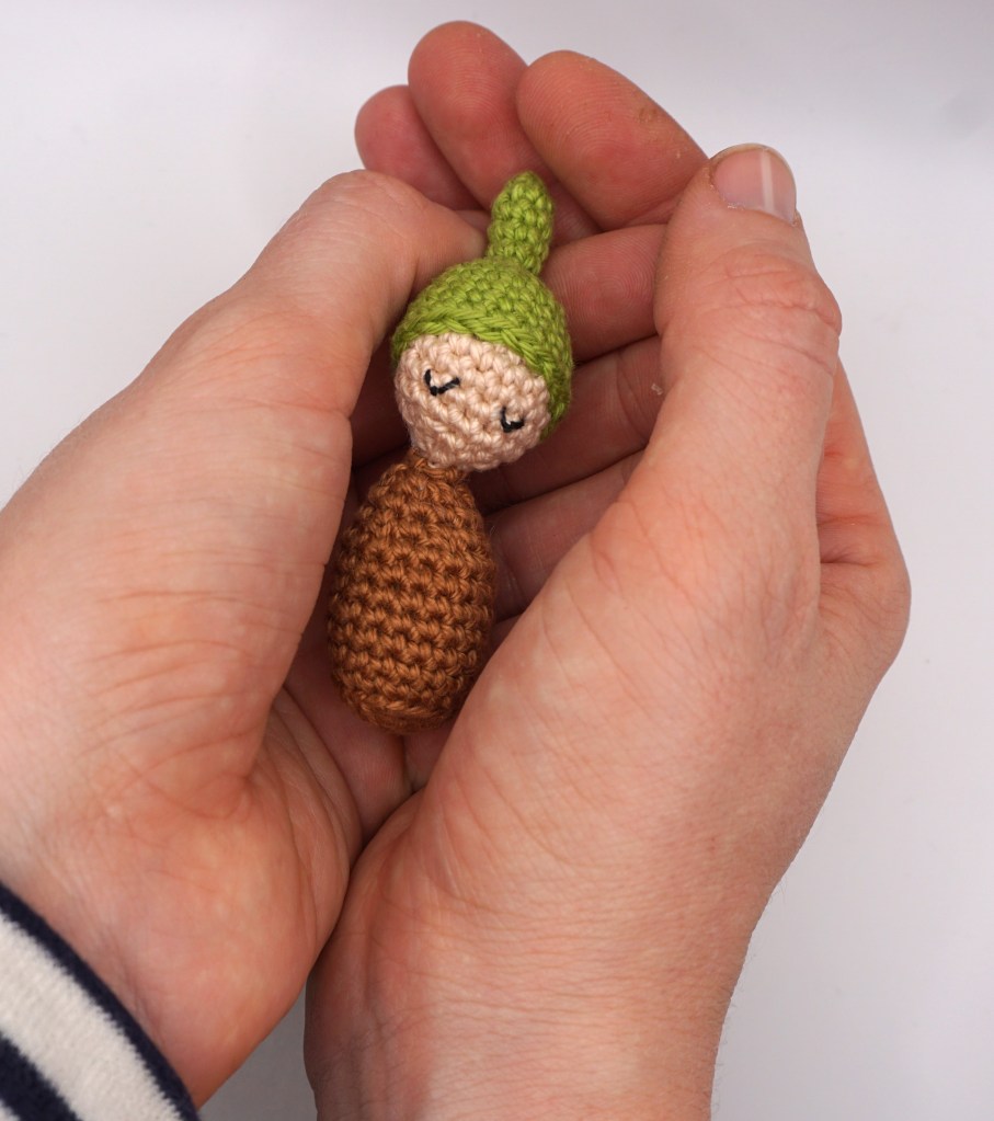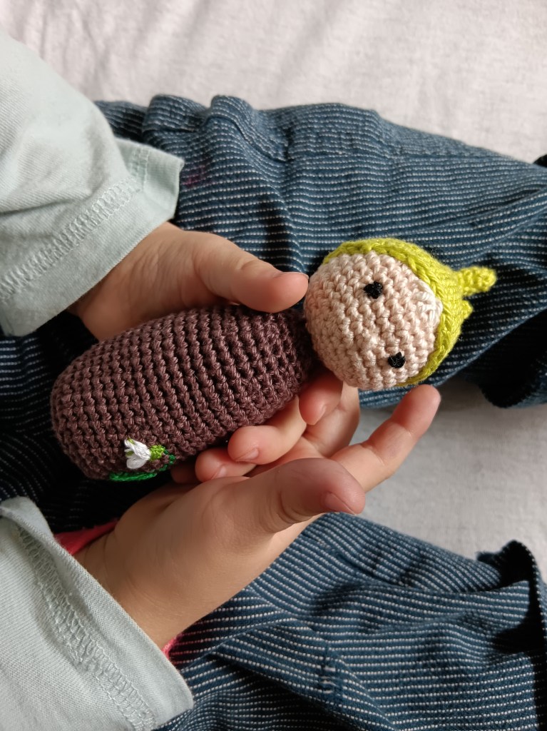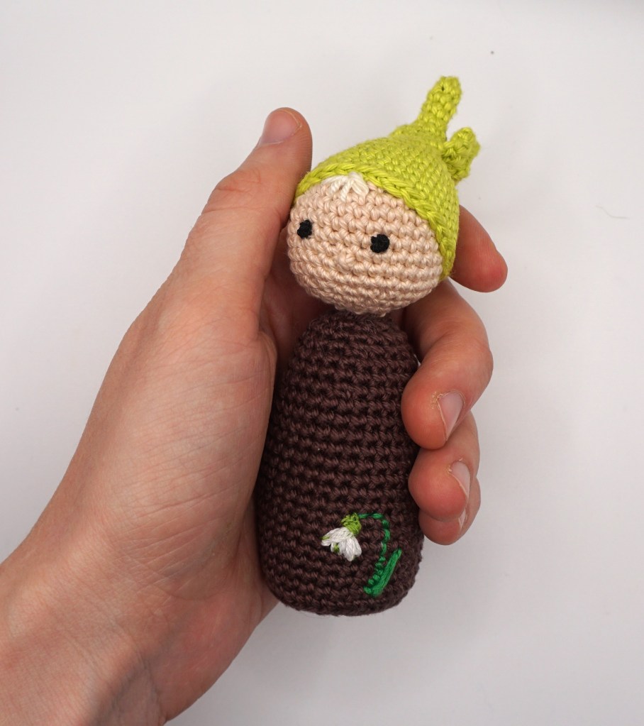 That’s why I came up with the snowdrop family consisting of a mother, a young snowdrop and a baby. The mother wears an apron and can carry the baby in her babycarrier, the young snowdrop with its soft green hat reminding of sprouts shows off its embroidered snowdrop and the three of them form a really lovely family.