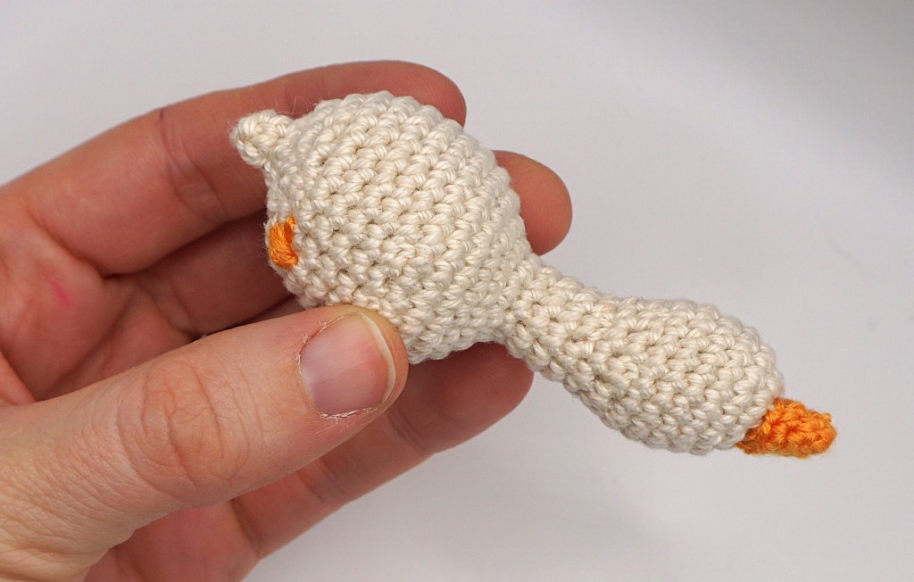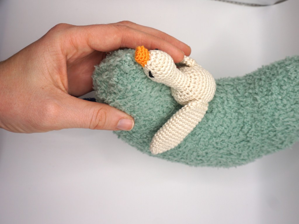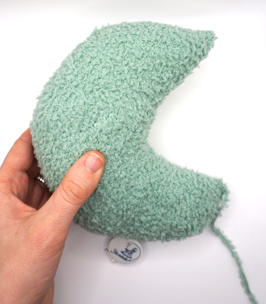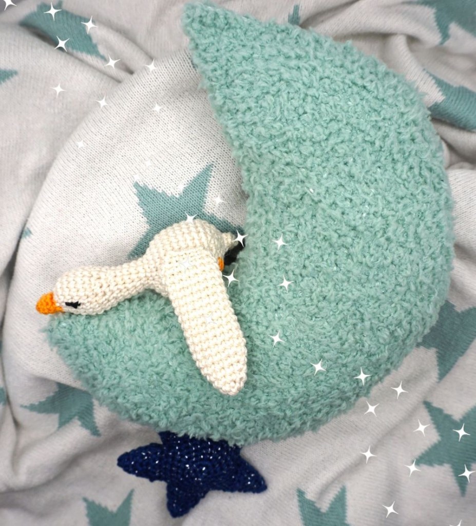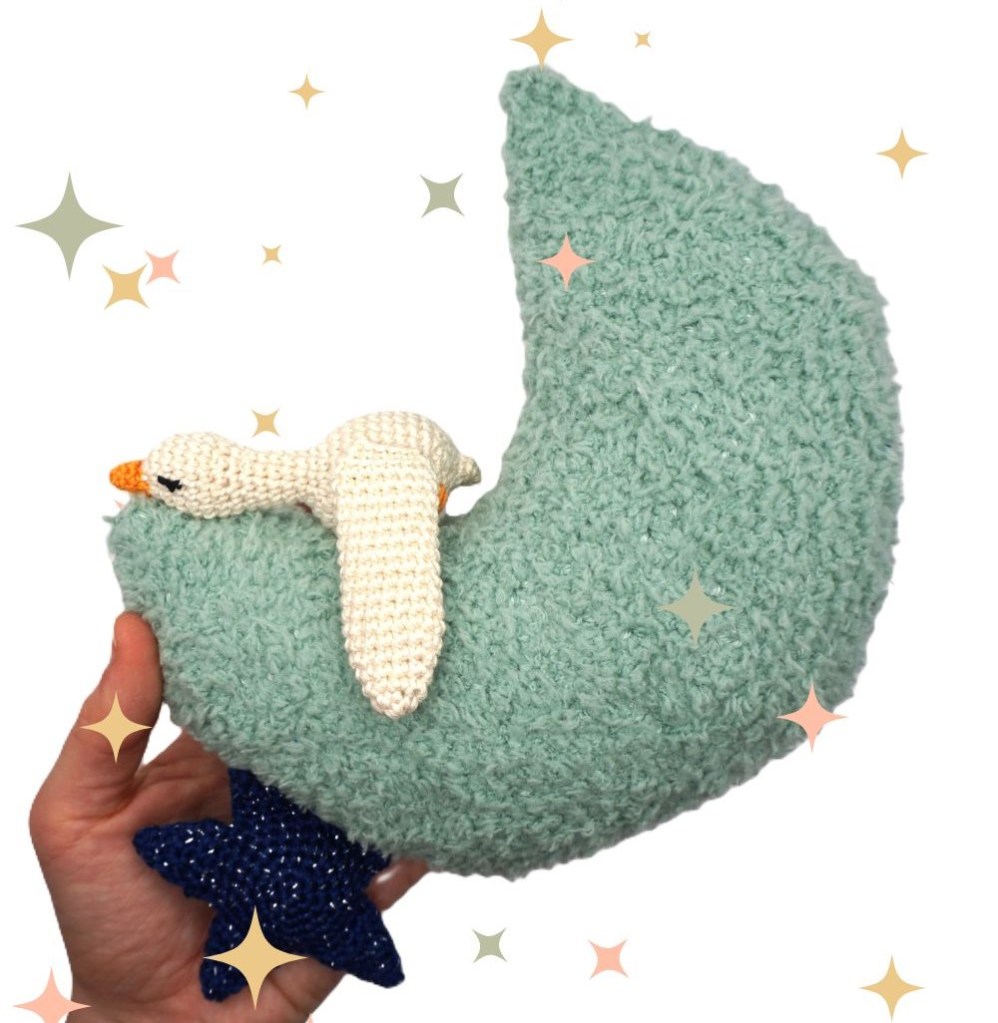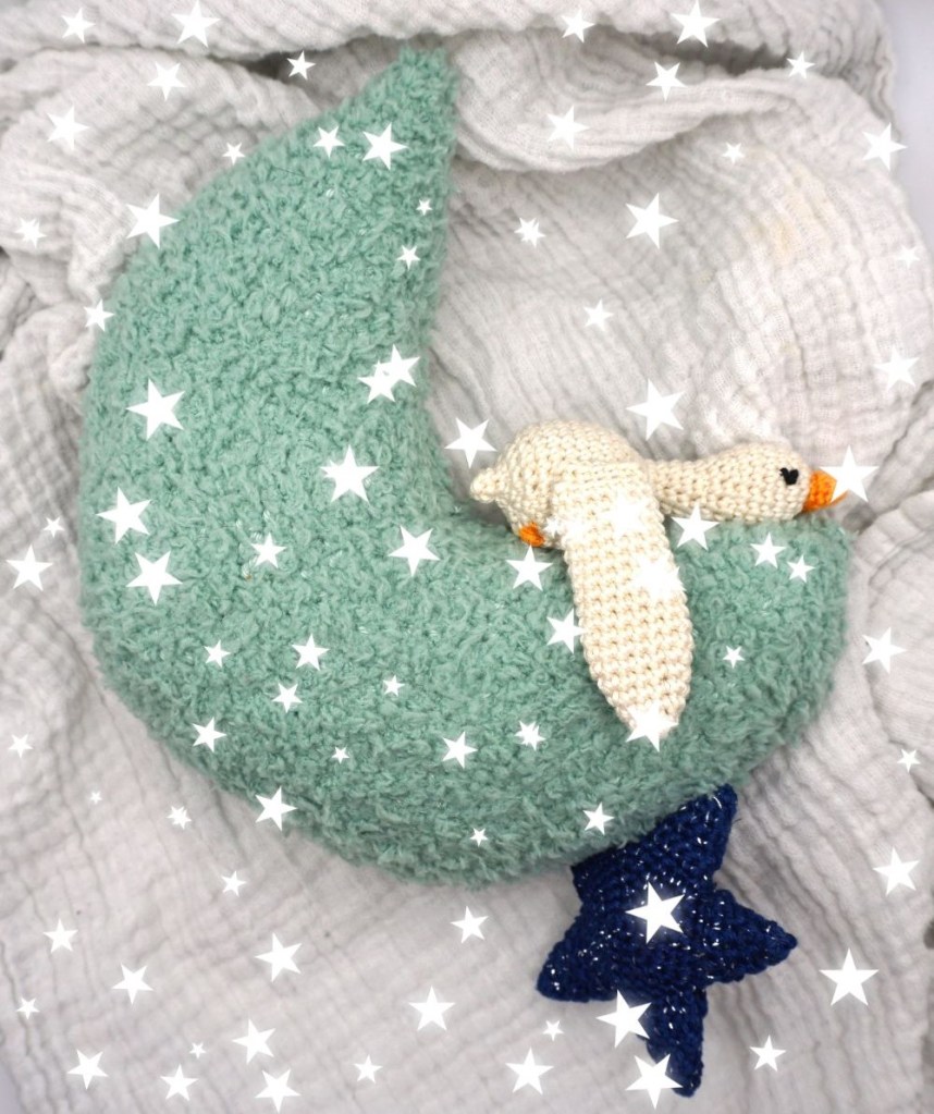 It’s a sweet little goose sleeping on a fluffy moon with a small star. The moon is very easy to crochet and I put a lot of work in the aspect of security. I can never give a guarantee – with handmade toys this is simply not possible. But sometimes I really don’t understand crochet patterns for baby toys that are full of very small pieces just sewed on – for me, that is not safe enough. So this goose on the moon should really be as safe for the baby as a handmade toy can be!