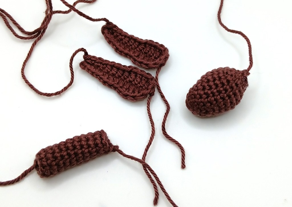 Ch14, 1 slst, 3 sc, 4 hdc, 4 dc, 2 sc (2nd sc is on the opposite side of the ch), 4 dc, 4 hdc, 3 sc, 1 slst. Fasten off and leave long tail.